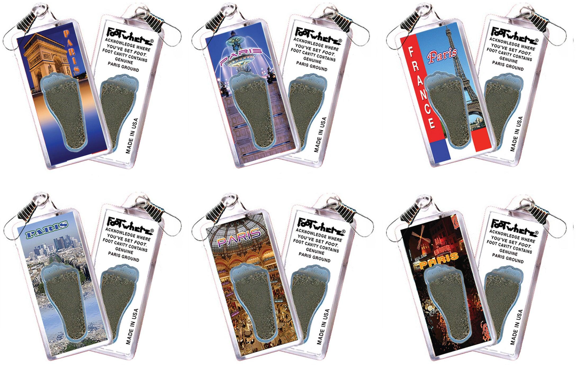 Paris FootWhere® Souvenir Keychains. 6 Piece Set. Made in USA