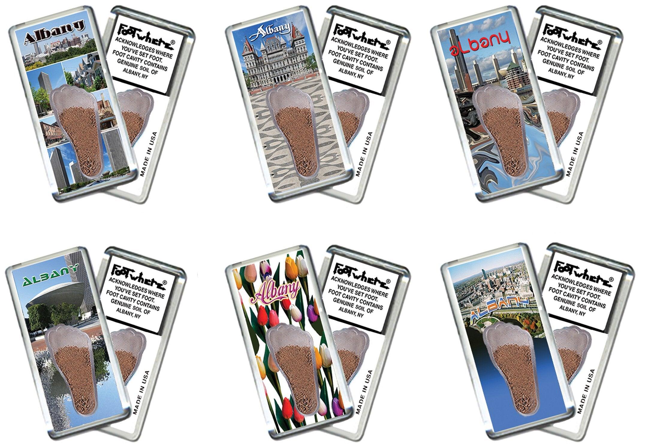 Albany, NY FootWhere® Souvenir Fridge Magnets. 6 Piece Set. Made in USA
