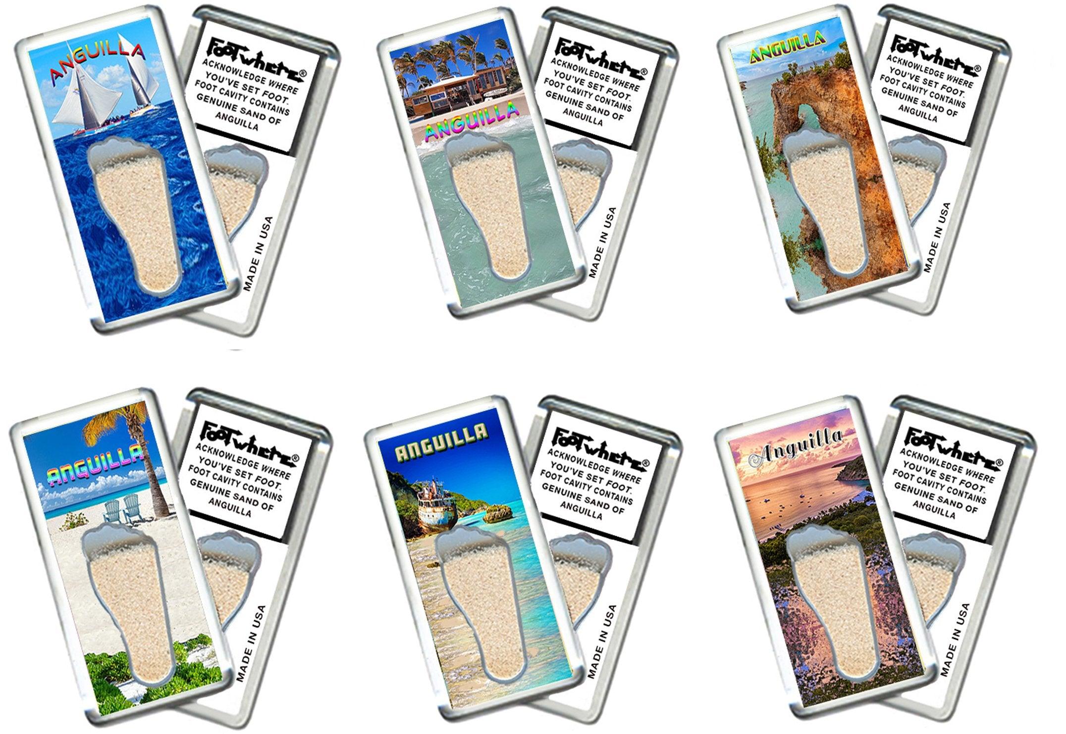 Anguilla FootWhere® Souvenir Fridge Magnets. 6 Piece Set. Made in USA