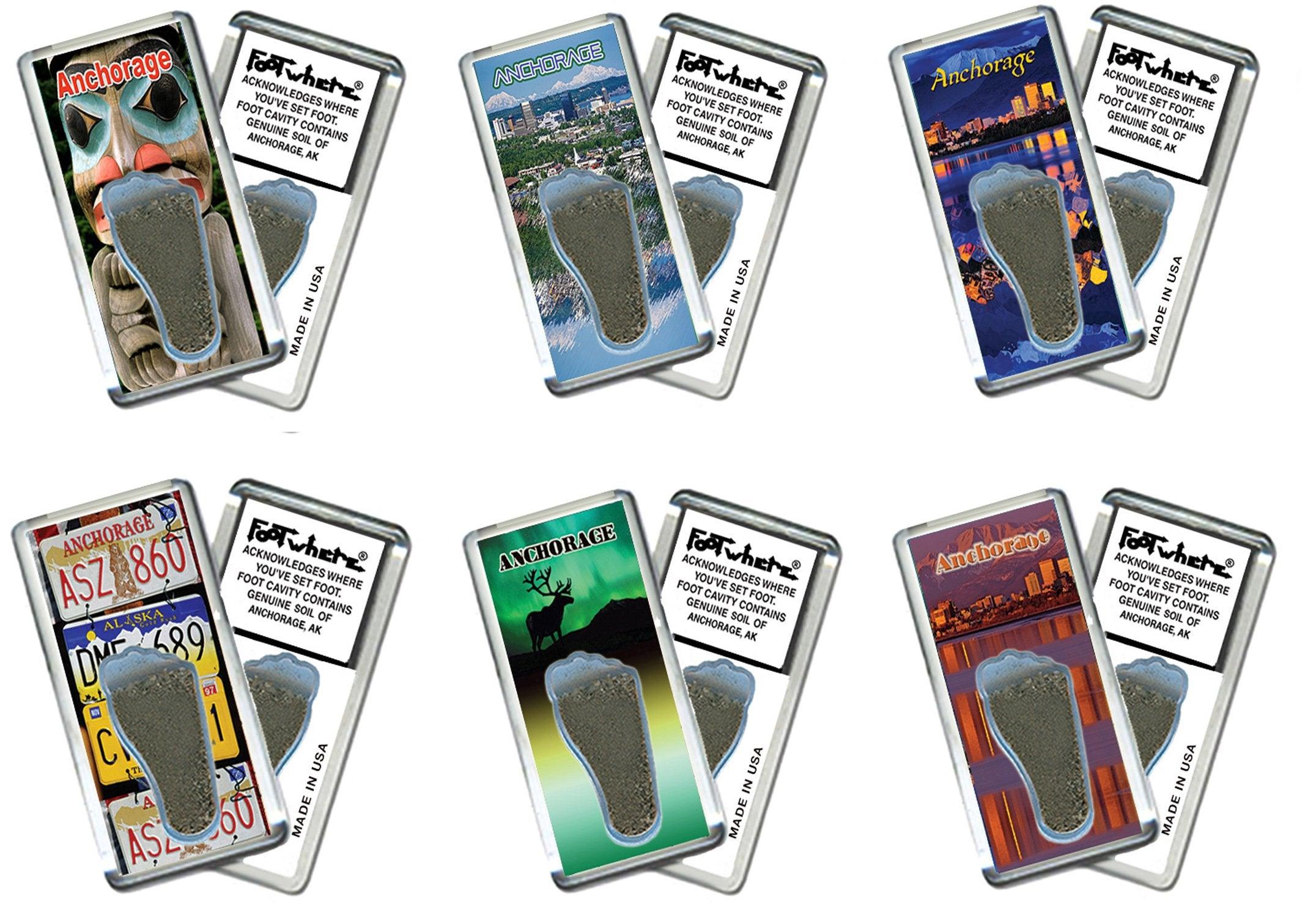 Anchorage FootWhere® Souvenir Fridge Magnets. 6 Piece Set. Made in USA