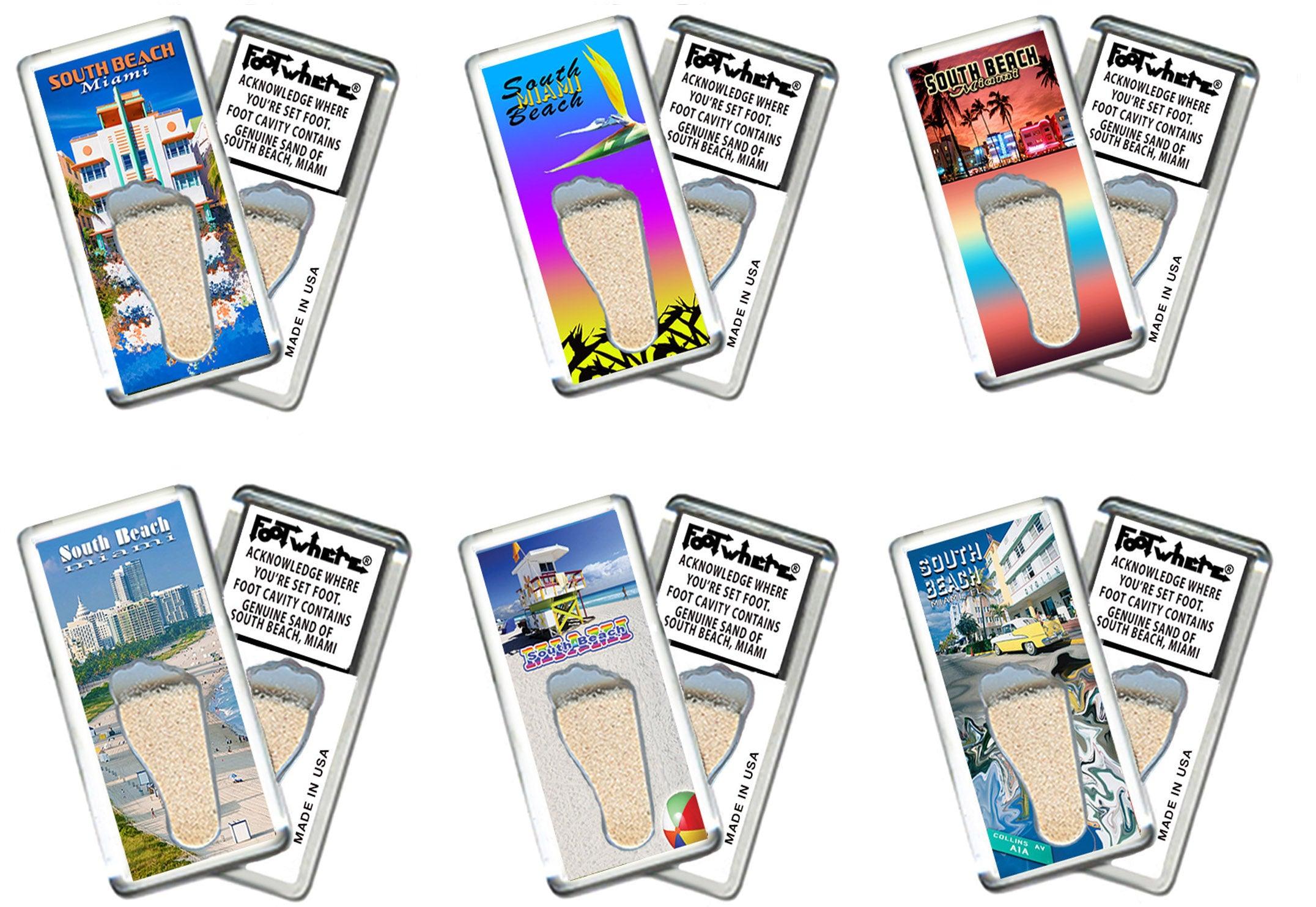 South Beach Miami FootWhere® Souvenir Fridge Magnets. 6 Piece Set. Made in USA