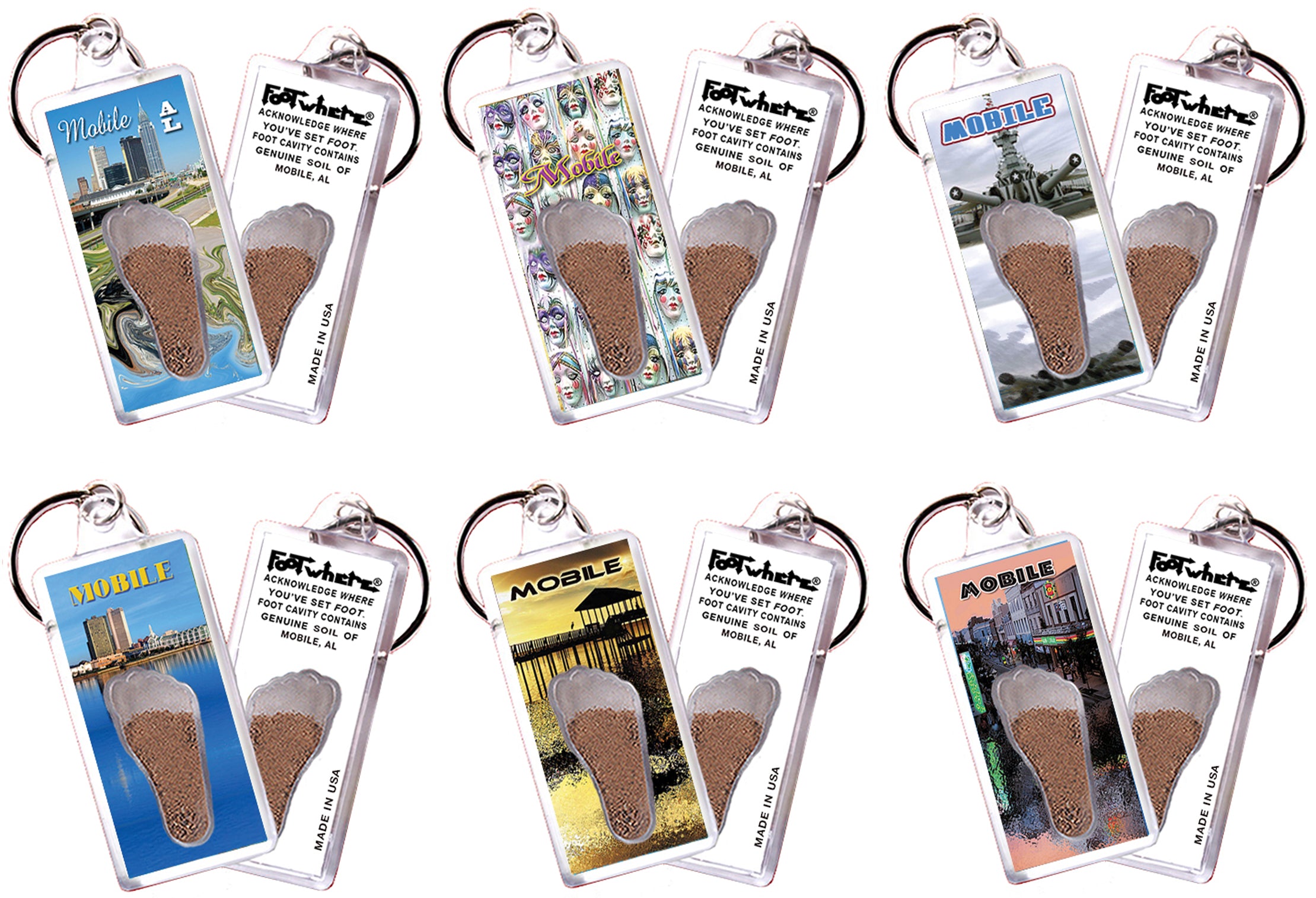 Mobile FootWhere® Souvenir Keychains 6 Piece Set. Made in USA