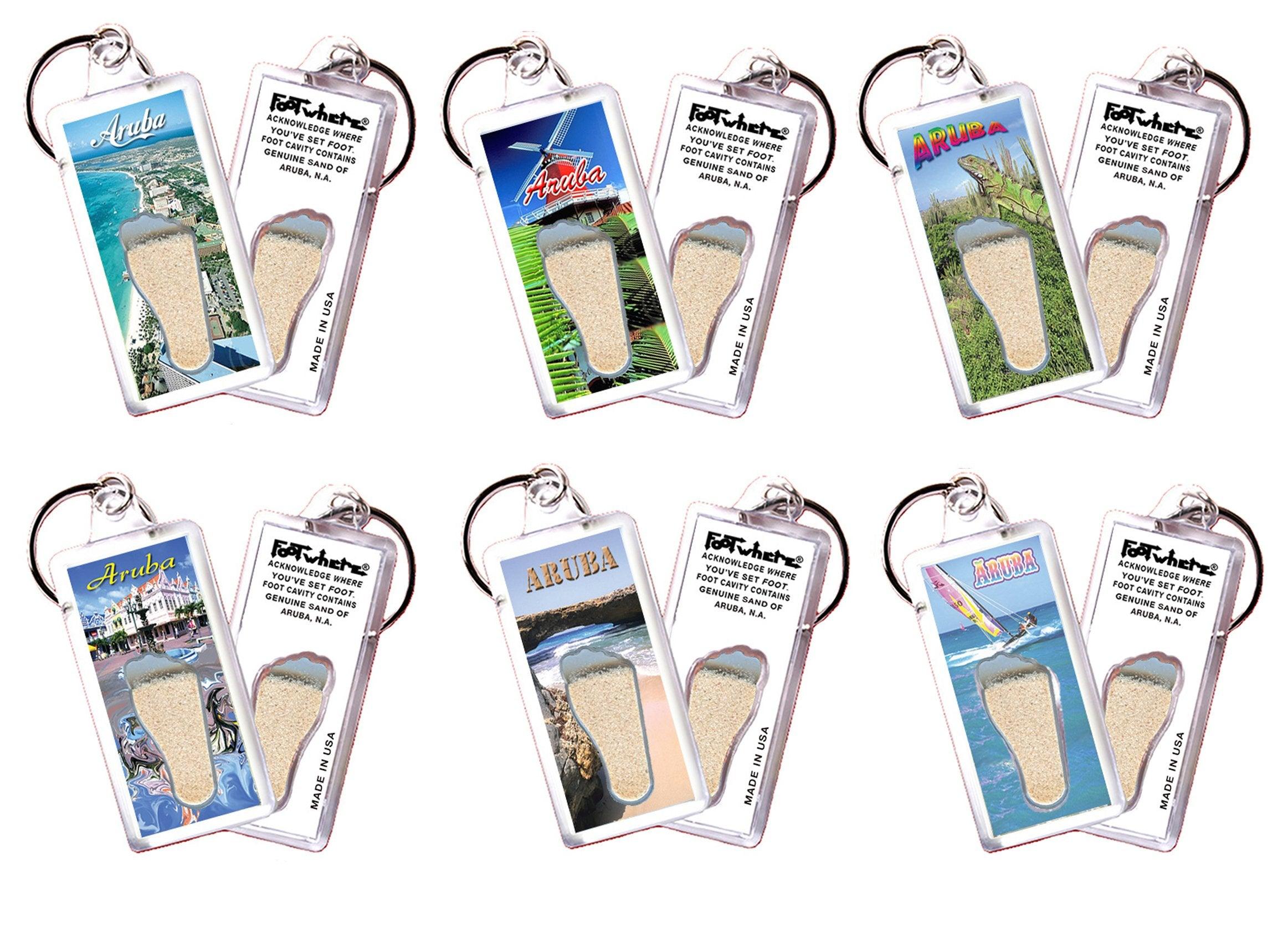 Aruba FootWhere® Souvenir Keychains. 6 Piece Set. Made in USA