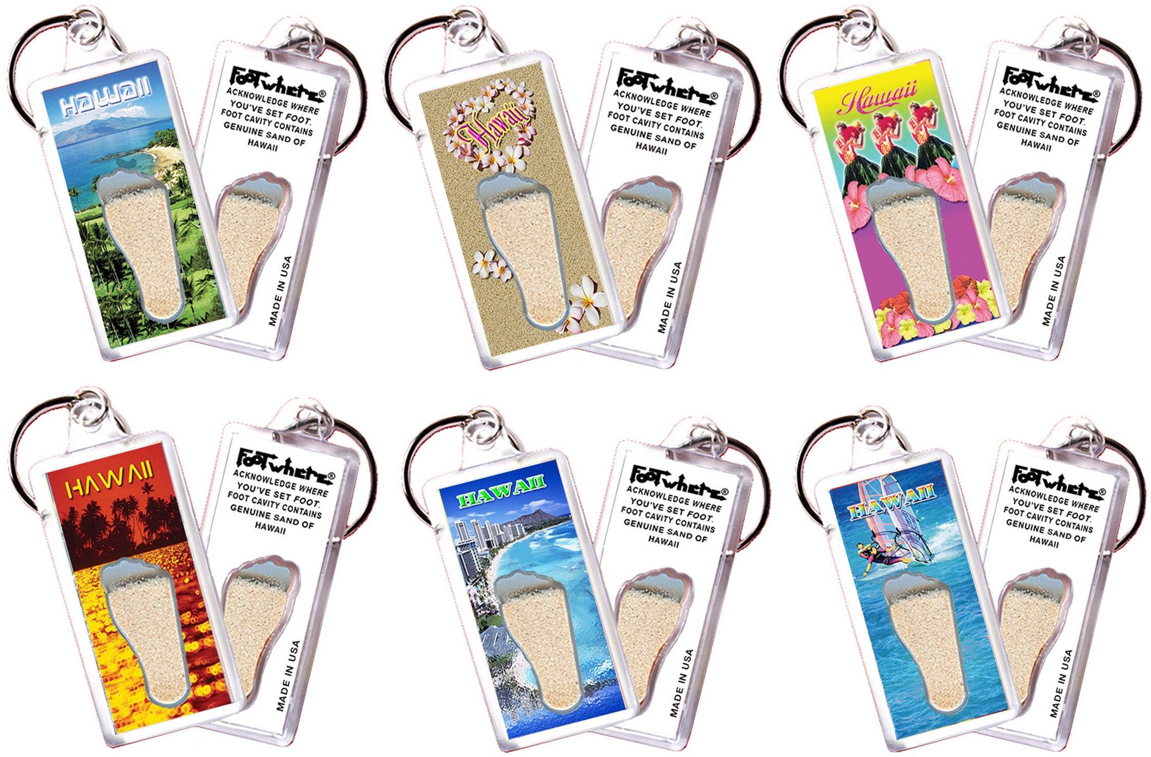 Hawaii FootWhere® Souvenir Keychains. 6 Piece Set. Made in USA