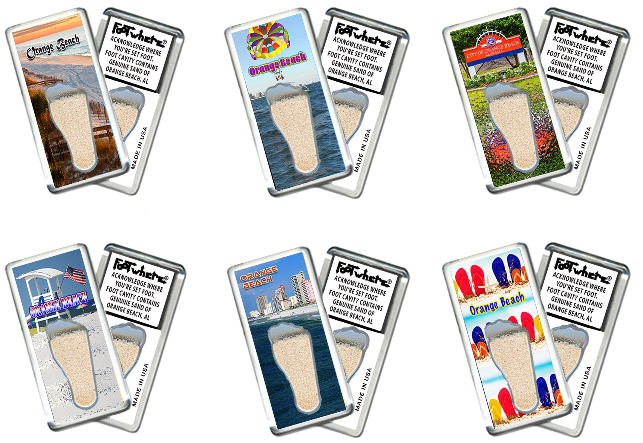 Orange Beach FootWhere® Souvenir Magnets. 72 pieces/6 assorted styles.
