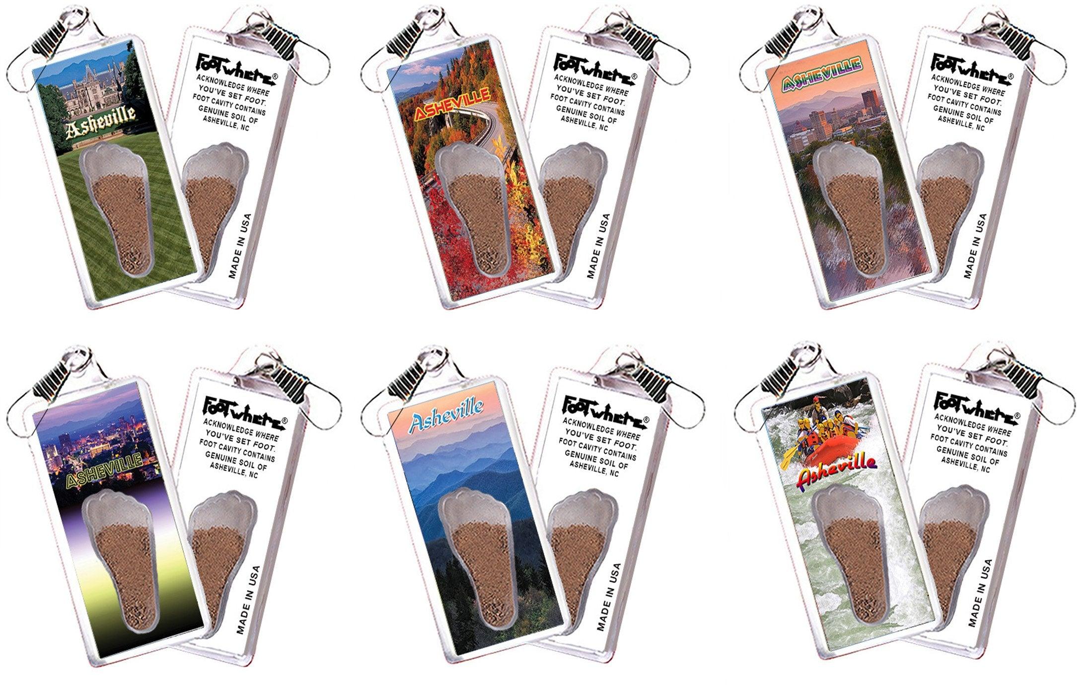 Asheville, NC FootWhere® Souvenir Zipper-Pulls. 6 Piece Set. Made in USA