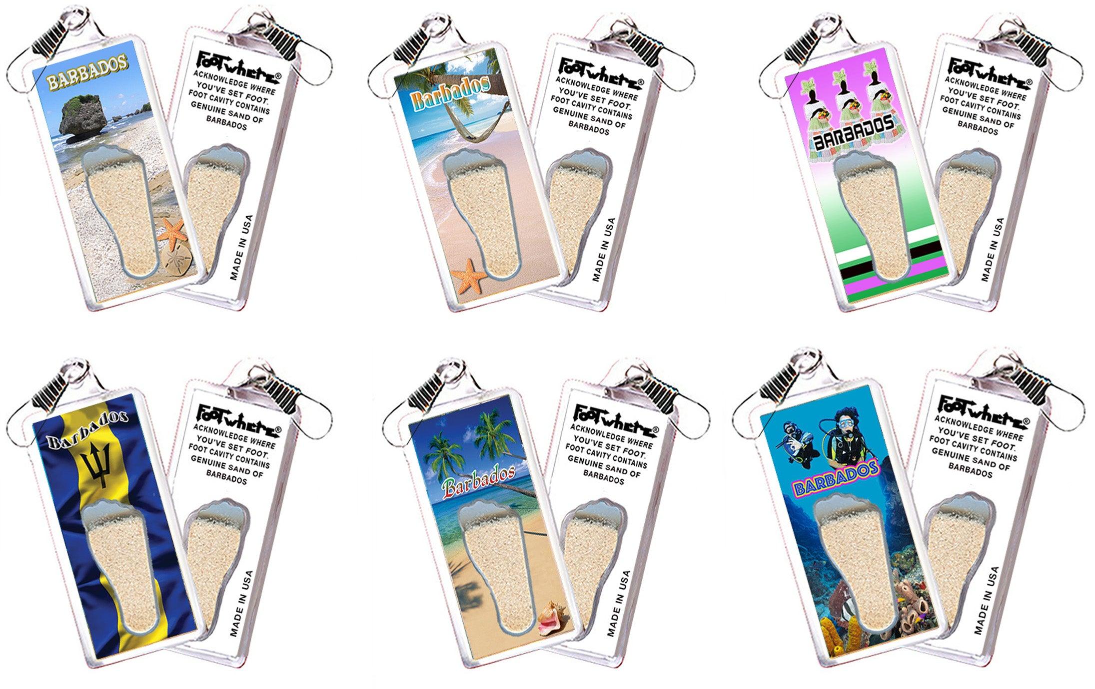 Barbados FootWhere® Souvenir Zipper-Pulls. 6 Piece Set. Made in USA