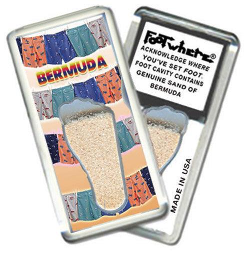 An ensemble of authentic Bermuda FootWhere® souvenir fridge magnets acknowledging where you've actually set foot. Foot cavity is filled with genuine Bermuda world renown pink sand. Made of high-quality acrylic with high-resolution graphic insert showcasing the featured destination on the front and back. Protected for life between ultrasonically-welded halves.